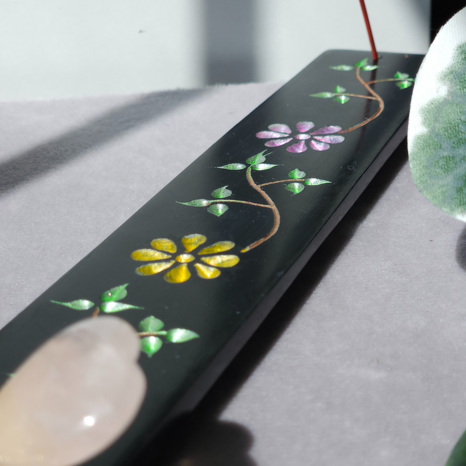 Smilkalinės pagrindas pagamintas iš juodo poliruoto muilo akmens, raižytas ir nudažytas gražiomis gėlėmis.