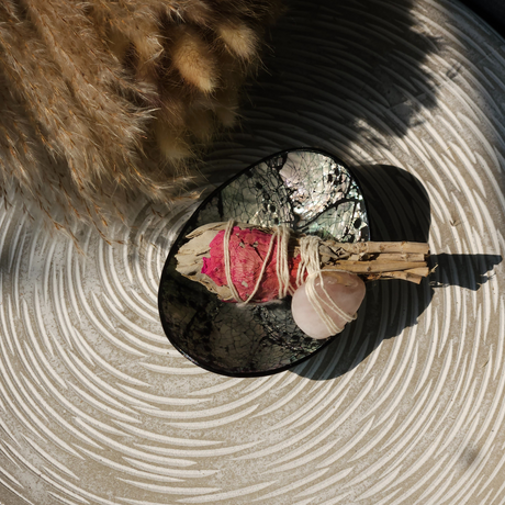 Baltojo šalavijo ryšulėlis su rožiniu kvarcu