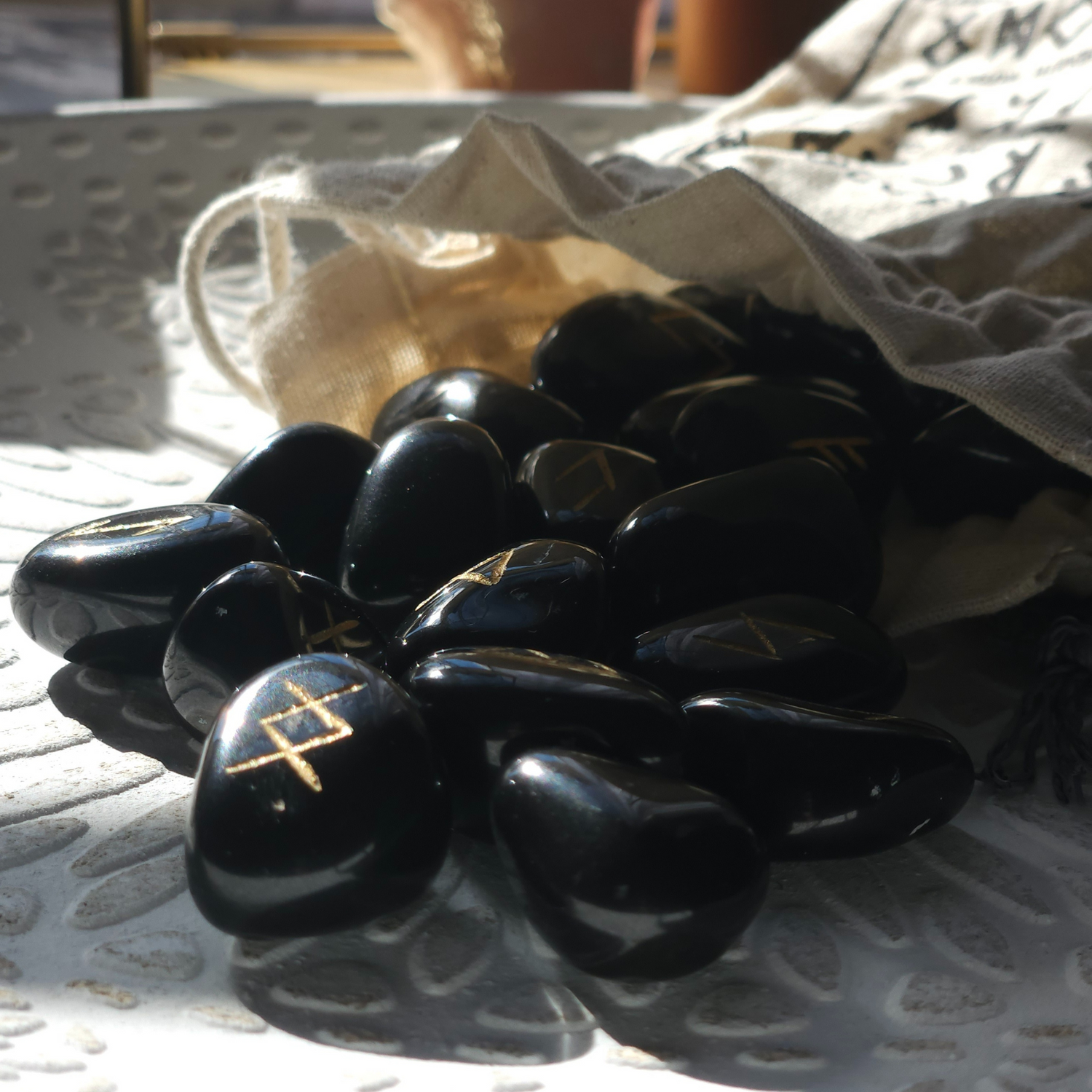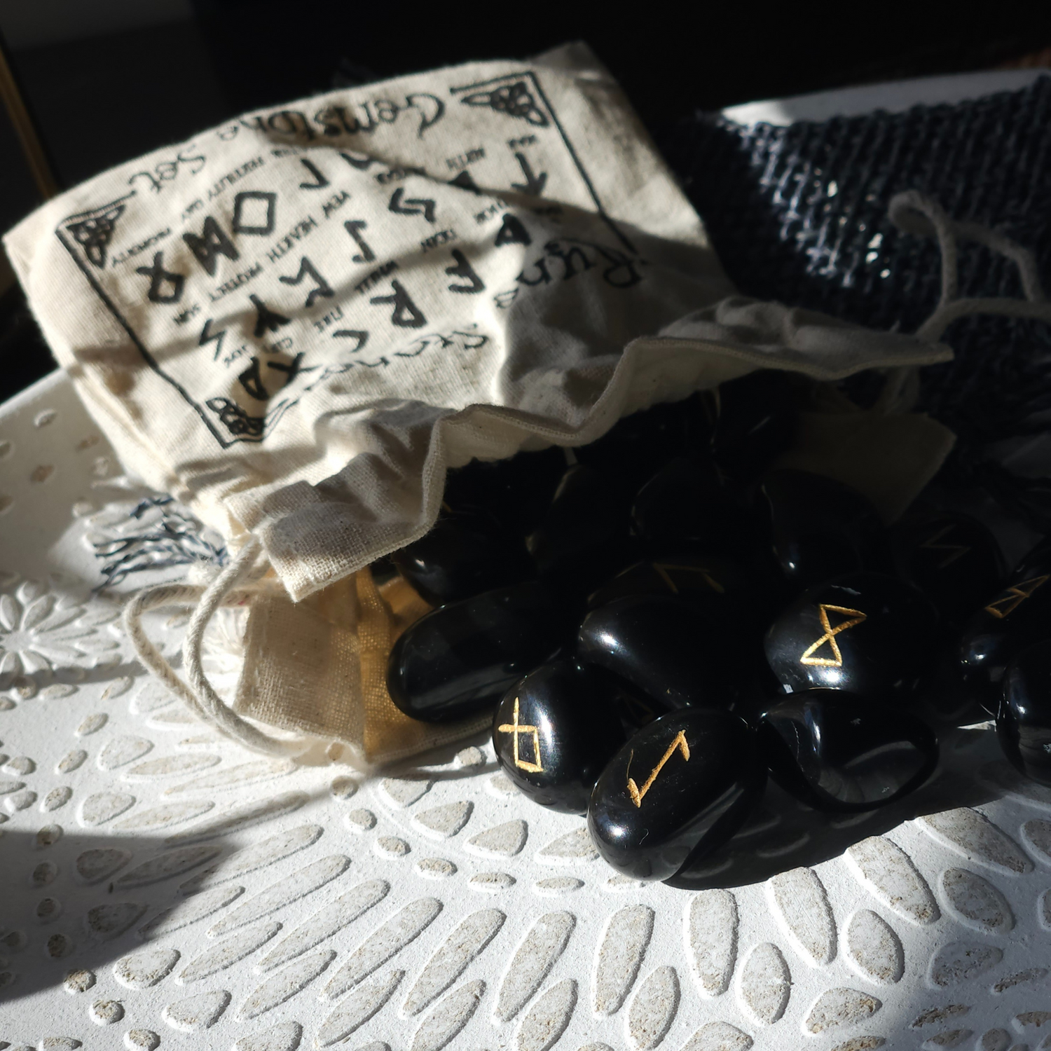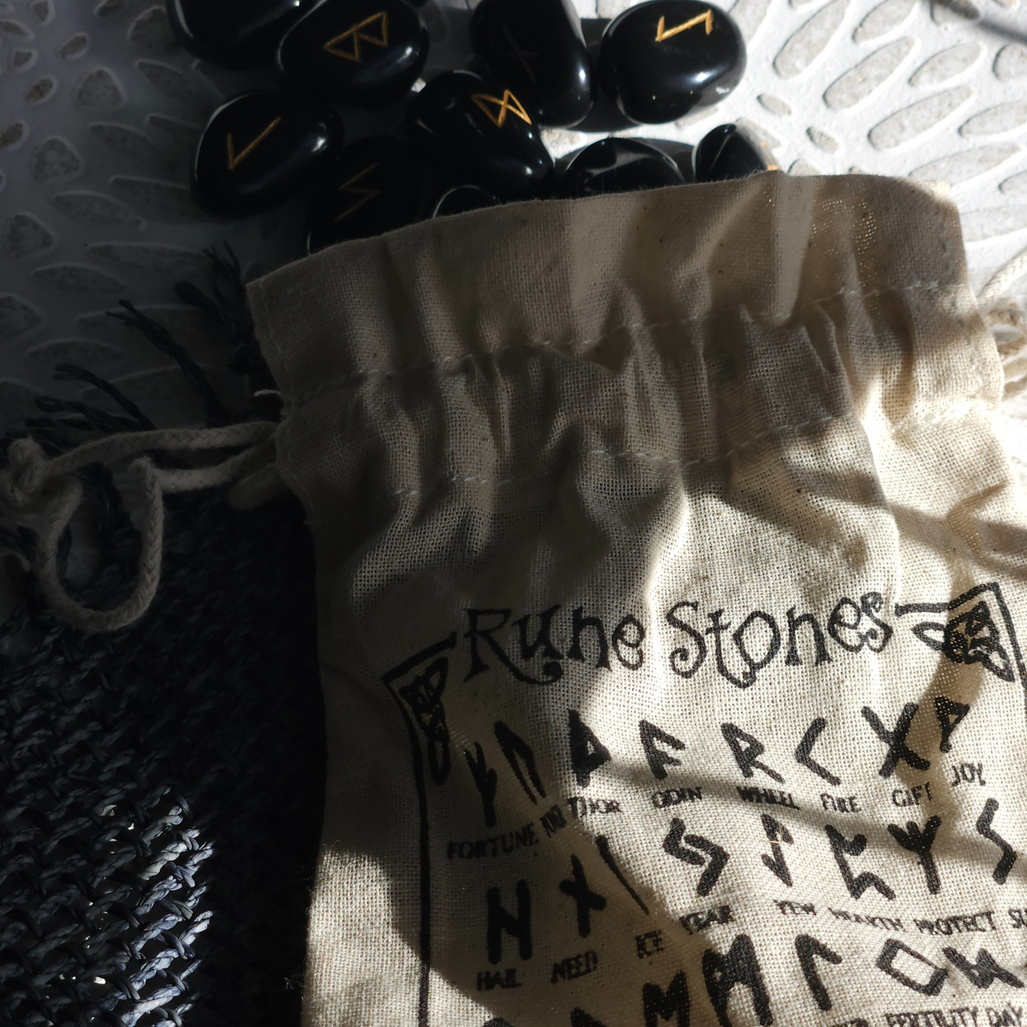 Gausite 25 runų akmenų rinkinį lininiame maišelyje ir naudojimo rekomendacijas. Kiekvieno akmens dydis yra maždaug 1–2 cm.