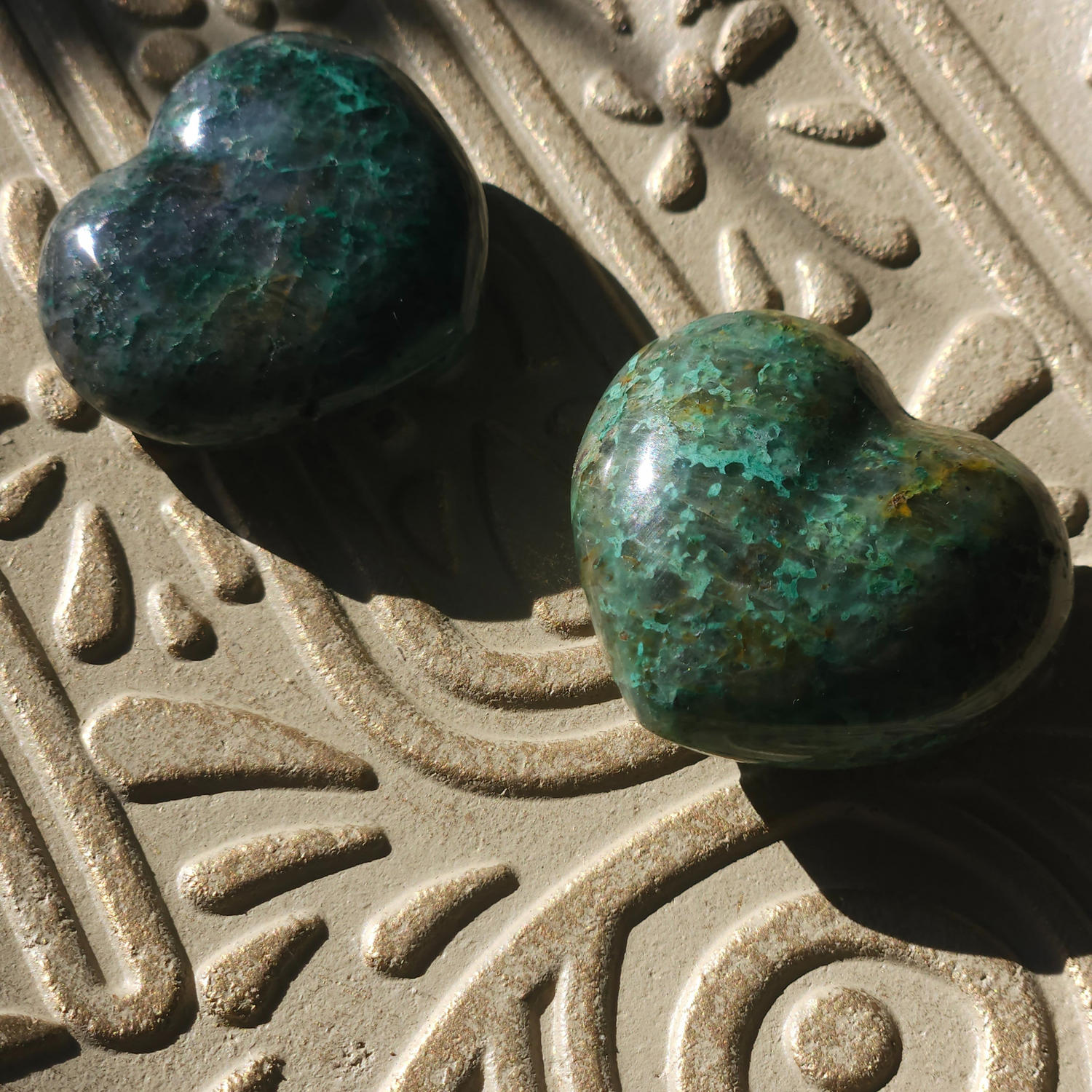 Kai būsite pasiruošę pasakyti savo šventą tiesą, ši chrizokolos širdis jums suteiks dievišką paramą. Chrizokola aktyvuoja gerklės čakrą, kad būtų galima aiškiai bendrauti, ir padeda rasti savo balsą pasaulyje. Ji taip pat įkūnija ištvermingos Deivės intelektą ir stiprybę. Padeda jums bendrauti su kitais, suteikdama drąsos laisvai reikšti save ir išmintingai bei sąžiningai perteikti savo poreikius. Kleopatra šį akmenį naudojo kaip savo diplomatinį talismaną, kad atvertų duris ir užtikrintų stabilias derybas.