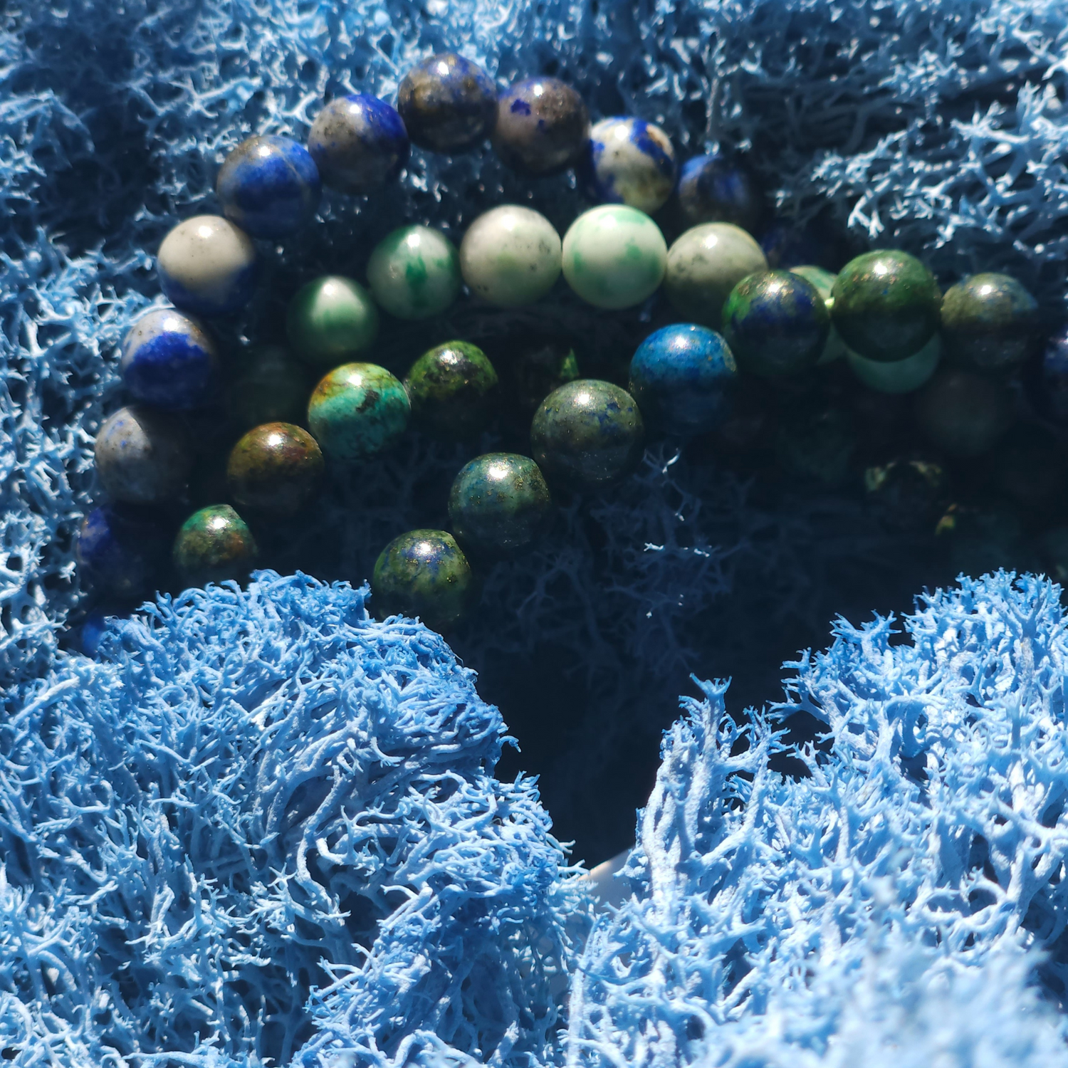 Azuritas – malachitas, kuris sujungia gilų įžvalgumą su transformuojančia energija. Šis galingas duetas lavina intuiciją ir skatina sąžiningą, išmintingą raišką iš sielos gelmių.