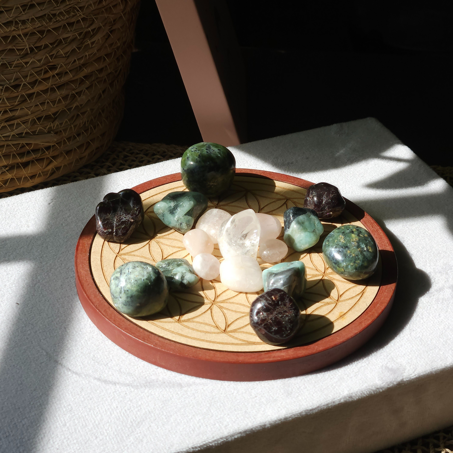 Padėkite tinklelį tokioje vietoje, kurioje galėsite jį kurį laiką laikyti. Išimkite akmenis iš maišelio ir nuplaukite juos po tekančiu vandeniu. Susitelkite į savo ketinimą, suformuluokite teiginį ir užrašykite jį ant popieriaus lapo. Padėkite popieriaus lapą po kristalu tinklelio centre. Tai simbolizuoja akmenims skirtą misiją. Tada išdėliokite kitus akmenis pagal grafike nurodytus skaičius, sutelkdami dėmesį į savo ketinimą.