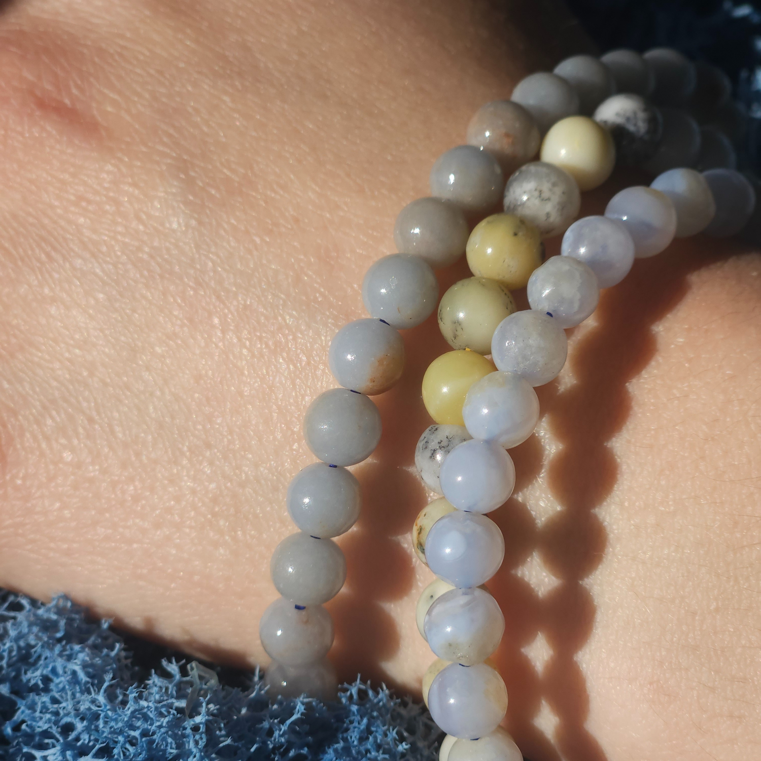 Pasinerkite į šio raminančio trejeto ramų glėbį. Angelitas, mėlynasis chalcedonas ir opalas dendritas susijungia, kad puoselėtų jūsų širdį, nuramintų protą ir subalansuotų sielą.