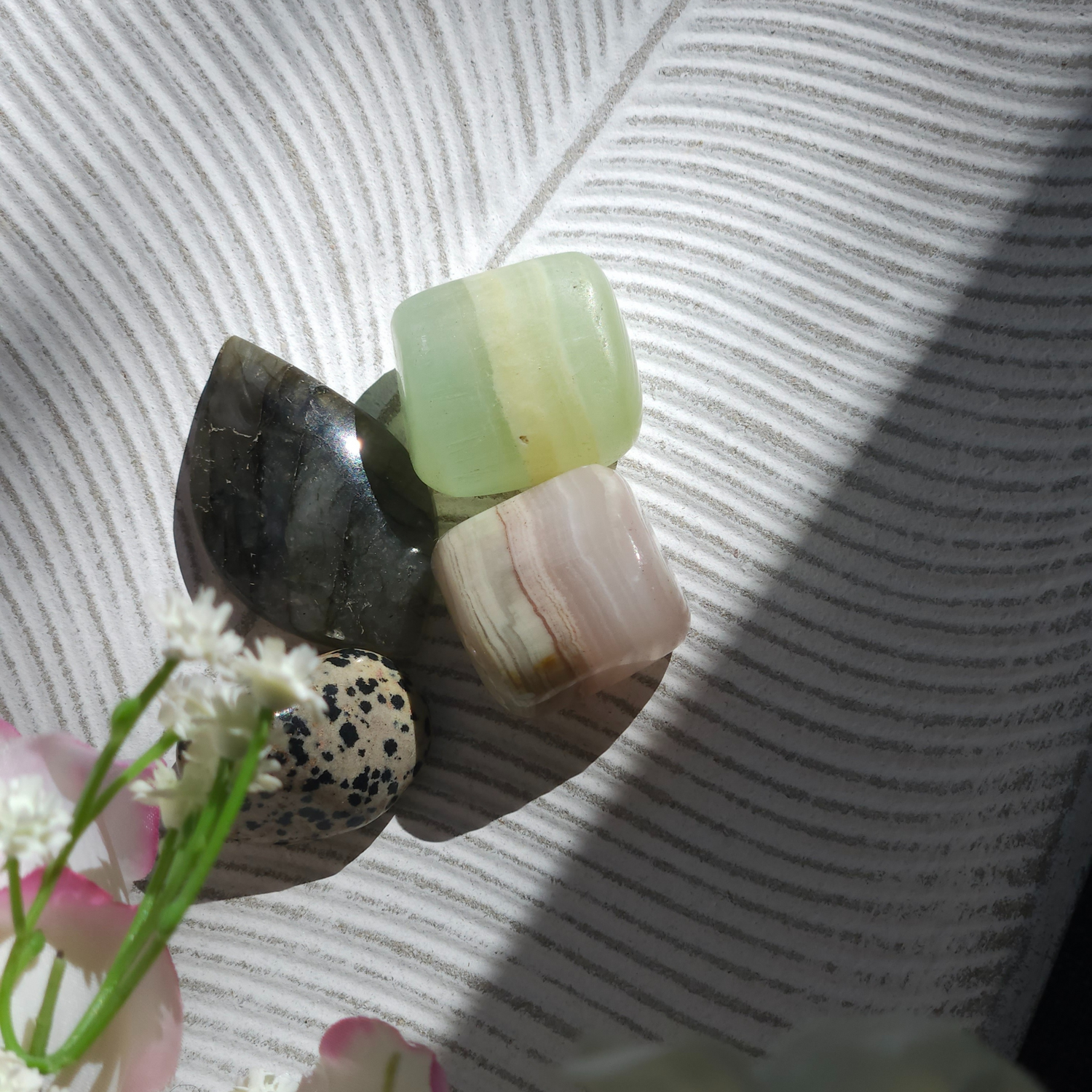 Rožinis juostinis oniksas suteikia drąsos susipažinti su naujais žmonėmis ir užmegzti naujų draugų. Naudodami šį kristalą, jus sups bendraminčiai, kurie dalinsis jūsų mintimis ir vizijomis.