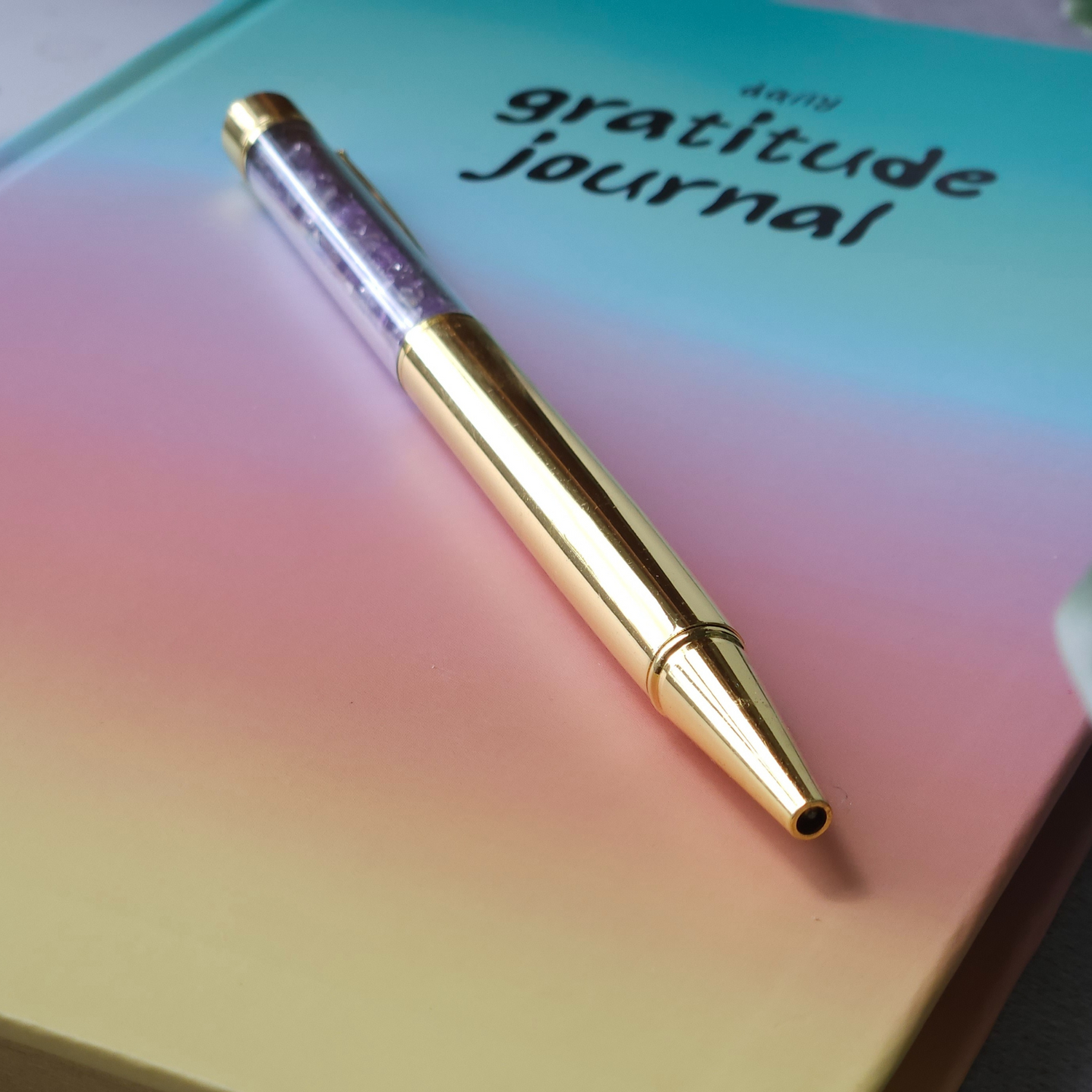 Įvairiaspalvis dėkingumo dienoraštis su ametisto rašikliu